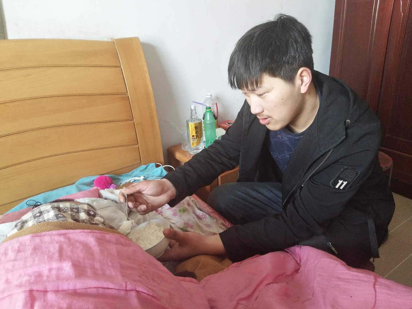 徐士堯是東辛農場西洋社區居委會居民,他自幼聰明伶俐、勤奮好學、成績優秀,和許多同齡的孩子一樣,他原本有個幸福的家庭,誰知命運多舛,在他上小學五年級的時候母親因意外事故去逝,2015年在他16歲讀高一的時候,厄運再次降臨,父親又因車禍導致高位截癱,臥床不起,生活不能自理,家里還有年邁多病80多歲的爺爺和奶奶,妹妹又正在讀小學,從此家里失去了頂梁柱,失去了經濟來源,又增添了一位需要照顧的常年臥床病人,這樣小小的年紀,徐士堯過早嘗到了生活的艱辛,面對家庭的不幸,生活的挫折,他沒有退縮,只有堅韌,毅然決然地用稚嫩肩膀挑起了家庭生活的重擔,含淚放棄了自己的未竟學業,放棄了自己的大學夢想,放棄了自己的錦秀前程,回到家中悉心照顧癱瘓的父親,端屎端尿、喂飯喂藥、翻身擦背……徐士堯無微不至地照顧著父親,每天從早到晚不厭其煩,不怕臟不怕累,同時在網上開店創業補貼家用,重新點燃了這個不幸家庭生活的希望。