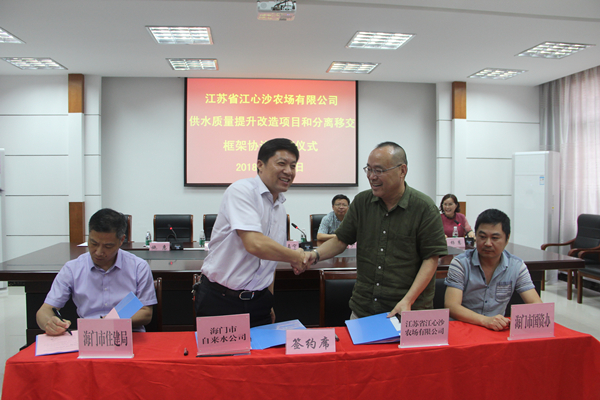 沈雪松表示,非常榮幸能夠見證江心沙農場改革進程中具有里程碑意義的節點和事件。他說,江心沙從地理位置和感情上來講,和海門相濡以沫、唇齒相依,是一家人、一體化的。多年以來,場地之間一直相互支持、相互配合,共同促進、共同發展。現根據上級要求,作為住建系統,有責任有義務支持好江心沙的每一項改革。此前,海門市自來水公司與江心沙也進行了多次的磋商,前期工作已基本就緒,到了成熟階段。今天正式簽訂框架協議,標志著江心沙供水質量提升改造工程正式拉開了序幕。希望市自來水公司在以后的具體施工過程中,精心組織,按照時間節點,高質量高標準完成場域供水改造工程。