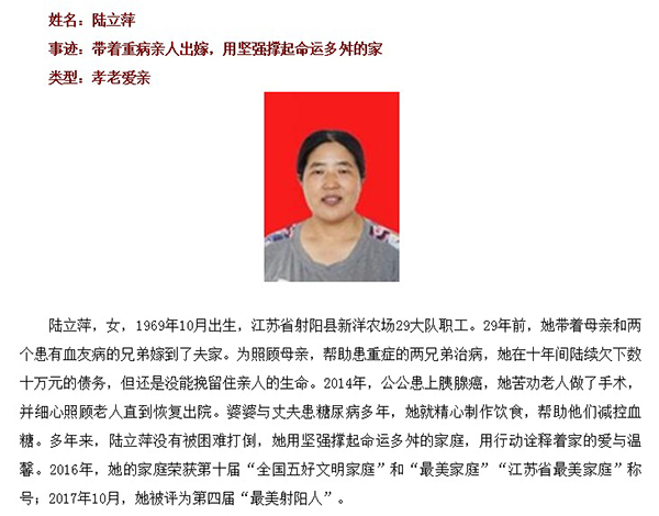 29年前,陸立萍帶著母親和兩個(gè)生病的兄弟嫁到夫家,哥哥、母親、弟弟相繼因病去世,治病留下數(shù)十萬(wàn)元的債務(wù)。在丈夫和公婆的疼愛與默默支持下,她堅(jiān)強(qiáng)走到今天。2014年,公公被確診為胰腺癌,老人住院期間,她貼心照顧,老人很快恢復(fù)出院;婆婆與丈夫均患糖尿病,她精心制作飲食,幫助減控血糖,用心詮釋著家的愛與溫馨。此前,陸立萍曾榮獲第十屆“全國(guó)五好文明家庭”、2016年全國(guó)“最美家庭”、2017年“最美射陽(yáng)人”等稱號(hào)。