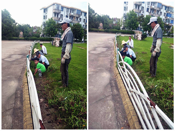 8月22日下午5點(diǎn),在新洋農(nóng)場有限公司機(jī)關(guān)大樓門前的草地上,幾名綠化工正在拔里面的雜草,他們當(dāng)中,一個穿綠衣服、看上去四五歲的小男孩吸引了路人的注意。