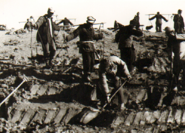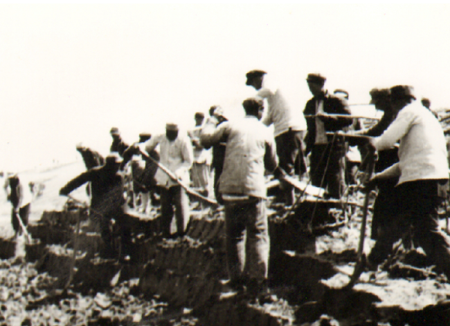 正因為江希友發明的“‘江大鍬’挖土法”在全農建四師的成功推廣和在水利戰役中的優良表現,1953年3月17日,他被農建四師表彰為"特等功臣"。并成為淮海農場建場60周年的10大知名人物。圖一是江希友在水利工地作挖溝示范。