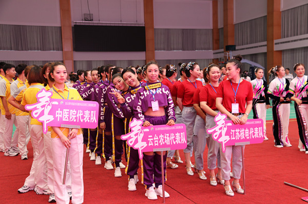 在比賽現(xiàn)場,云臺農(nóng)場有限公司代表隊隊員們勇于爭先,團(tuán)結(jié)協(xié)作,不畏強(qiáng)手。運動員們以風(fēng)格迥異,絢麗多姿的舞步給現(xiàn)場觀眾帶來精彩的表演。舞步或動感現(xiàn)代或剛?cè)岵?jì),贏得現(xiàn)場陣陣歡呼。