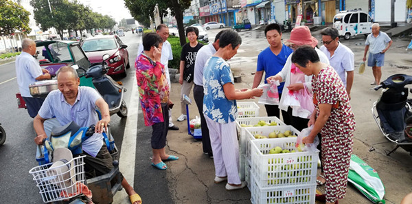 自7月15日三河梨園采摘季開始以來,三河社區(qū)的6名工作人員便從管理人員的角色轉(zhuǎn)變?yōu)?ldquo;賣貨郎”,每天清晨天不亮,修士超、張偉等6名年輕的管理人員便每天堅(jiān)持將精品包裝撿挑余下的四級梨分散到農(nóng)場農(nóng)貿(mào)市場和周邊鄉(xiāng)鎮(zhèn)的集市去賣,他們街邊擺攤設(shè)點(diǎn)叫賣的吆喝聲吸引得不少大爺大媽的圍觀并爭相購買三河梨,大家一邊買梨一邊樂呵呵的說,現(xiàn)在的干部可真行,賣起來梨來也是有模有樣的。