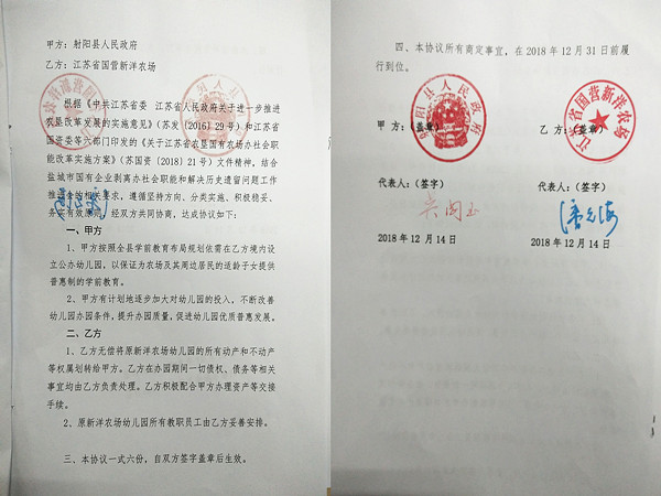 日前,新洋農(nóng)場與射陽縣人民政府正式簽訂了《江蘇省國營新洋農(nóng)場學(xué)前教育移交協(xié)議書》,縣政府依需在農(nóng)場境內(nèi)設(shè)立公辦幼兒園。