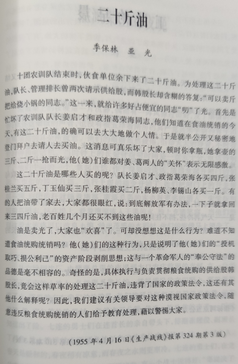 附:1955年4月16日第324期《生產戰線報》3版由作者季保林和亞光共同采寫的《二十斤油》的版面內容。