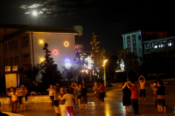 明月灑下一片皎潔的月光,與世紀廣場上的彩燈交相輝映,映照在熱舞中的男男女女身上,泛射出繽紛五彩,猶如是飄逸的彩云,在追逐天上的明月。
