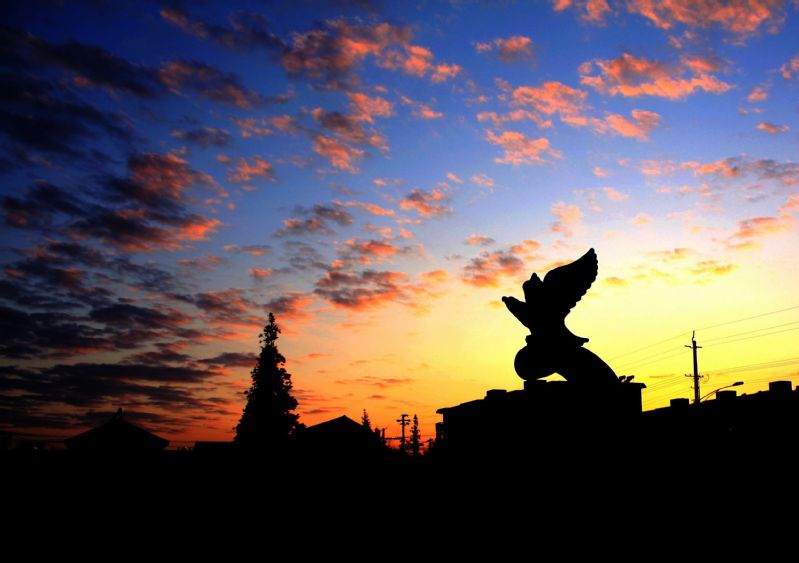 在新洋農場公司機關大樓前的中心花園中,屹立著一樽雕塑——鯤鵬展翅,這是新洋標志性景點,近30年來,它激勵著新洋人,不驕不躁,不滿足于現狀,為實現新洋夢,向著新的目標,展開騰飛的翅膀。