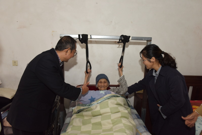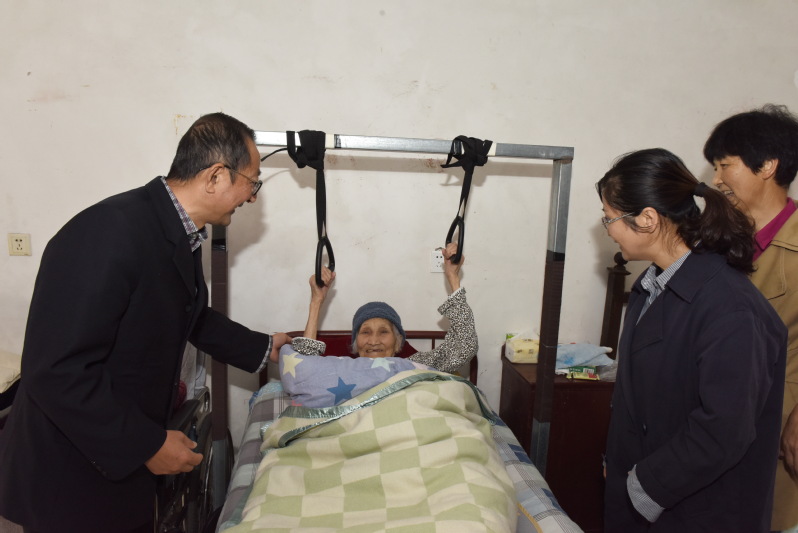 1027日上午,重陽節第三天,淮海農場工會和社區老齡委負責人深入轄區走訪看望農場健在的3百歲老人,為老人送上慰問金和節日的問候。當慰問人員還來到了農場振興小區,向居住在女兒家并癱瘓在床上的丁吉女表達節日的問候,遞上了慰問金時,大家對懸掛在床上方的吊環表現出了濃厚的興趣。