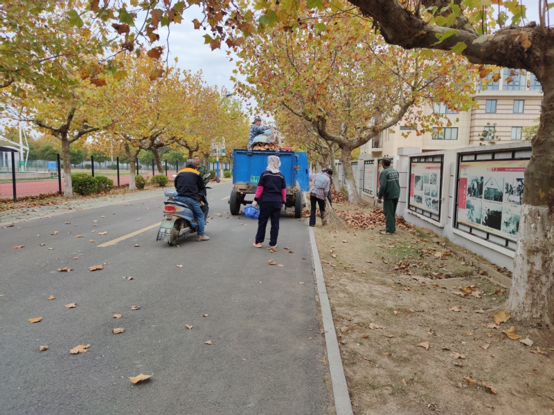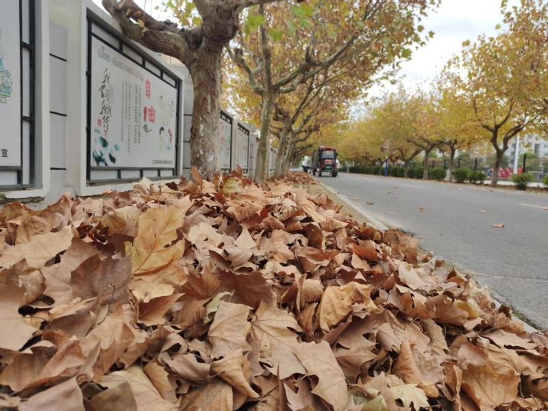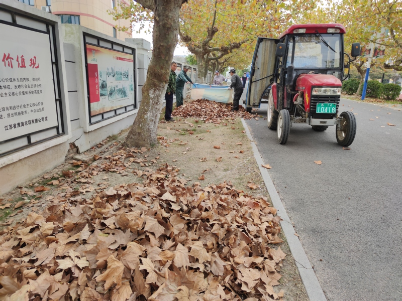 連日來,隨著秋后霜降和大風(fēng)的侵襲,沿路梧桐樹、香樟樹的樹葉掉落了不少,有時隨著風(fēng)兒樹葉紛紛揚揚地飄蕩,給農(nóng)場路面的環(huán)境衛(wèi)生帶來的困擾。我們注意到,11月5日下午,在淮海創(chuàng)業(yè)路上,一車拖拉機和五六名環(huán)衛(wèi)職工,依次把清掃出來成堆的樹葉進(jìn)行打包裝車,將樹葉清理走,以保證農(nóng)場在遇到特殊的天氣條件下,仍然以較好的路道清潔質(zhì)量,來“刷新”農(nóng)場小城鎮(zhèn)的道路視覺環(huán)境。