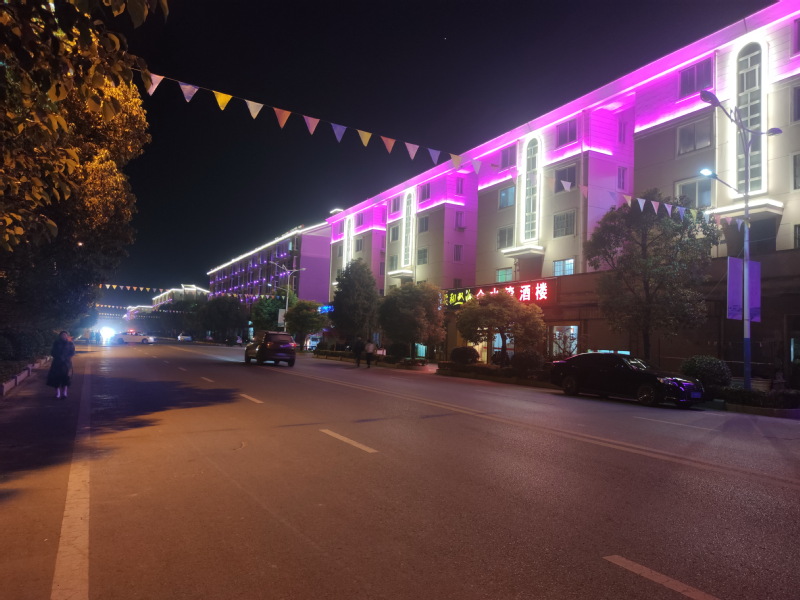 淮海路是農(nóng)場的主干道,四車道的道路加上兩邊的停車線就有近30米,兩邊香樟樹茂密,紫薇花裝點,紅葉石楠搭配,路燈中的彩旗穿插其間,營造出了優(yōu)美的淮海路綠化環(huán)境。農(nóng)場的建設者們,為了讓農(nóng)場的夜色更有亮點和特色,也讓生活在這里的人們更有幸福感,通過夜間樓宇的亮化工程,讓道路兩邊及文化廣場周邊的樓宇輪廓燈、星燈、招牌燈、射燈及霓虹燈綻放在夜空,十分漂亮和養(yǎng)眼。