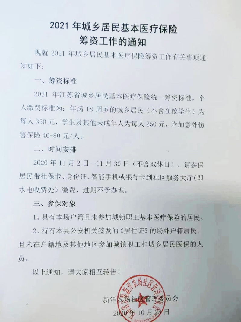 近日,筆者從新洋農場社區公共服務科了解到,新洋2021年度城鄉居民基本醫療保險參保繳費工作已全面啟動。今年,城鄉居民基本醫療保險個人繳費標準為每人350元,學生及其他未成年人為每人250元,附加意外傷害保險分別為40、80元每人。