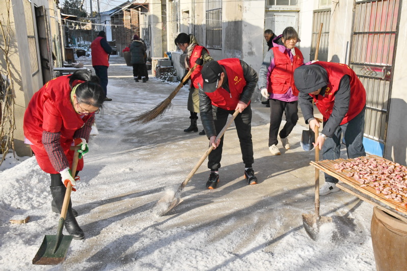 在這些老年職工居民的住房前、過道上,志愿者們齊心協力清掃積雪,有的掃,有的鏟,有的推。經過一個多小時的緊張勞動,家屬區門前及道路上的積雪和凍冰被打掃得干干凈凈,清除了積雪和冰凍帶來的容易滑倒的安全隱患,為老年人在冰地雪天行走安全創造了良好的環境。