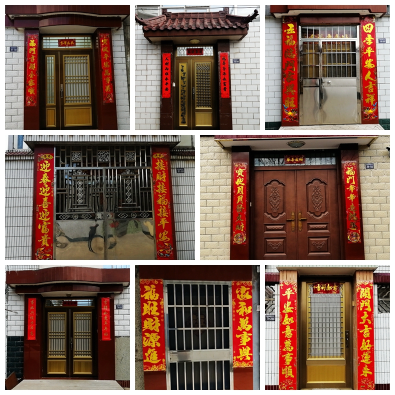 春聯(lián),又叫“春貼”、“門對”等,春節(jié)貼春聯(lián)是中華民族的年俗,每年春節(jié),家家戶戶都要在門上或門兩邊貼上大紅的春聯(lián),更增添了喜慶的節(jié)日氣氛。春聯(lián)以對仗工整、簡潔精巧的文字描繪美好形象,抒發(fā)美好愿望,是漢族特有的文學(xué)形式。紅色的春聯(lián)貼在大門上,房子頓時生輝。正如詩云:“喜氣臨門紅色妍,家家戶戶貼春聯(lián);舊年辭別迎新歲,時序車輪總向前。”