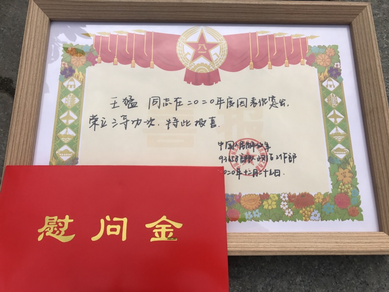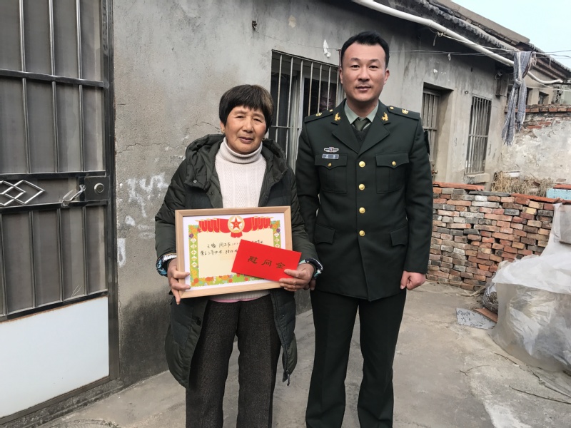 近日,淮海農場人武部干事董偉、社區服務科副科長崔慧慧等有關人員,為在部隊榮立三等功的現役軍人家庭送去立功喜報、慰問金和農場黨委的親切問候。