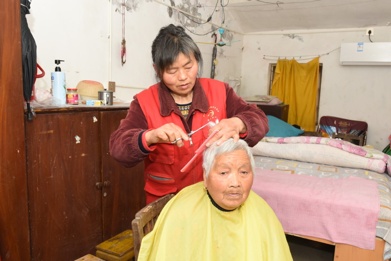 4月29日下午3時許,家住淮海農(nóng)場振興小區(qū)82歲的居民施維琴老人感覺十分清爽,因為淮海農(nóng)場居家養(yǎng)老志愿服務人員張榮芳,對她的頭發(fā)好好地修剪了一番。