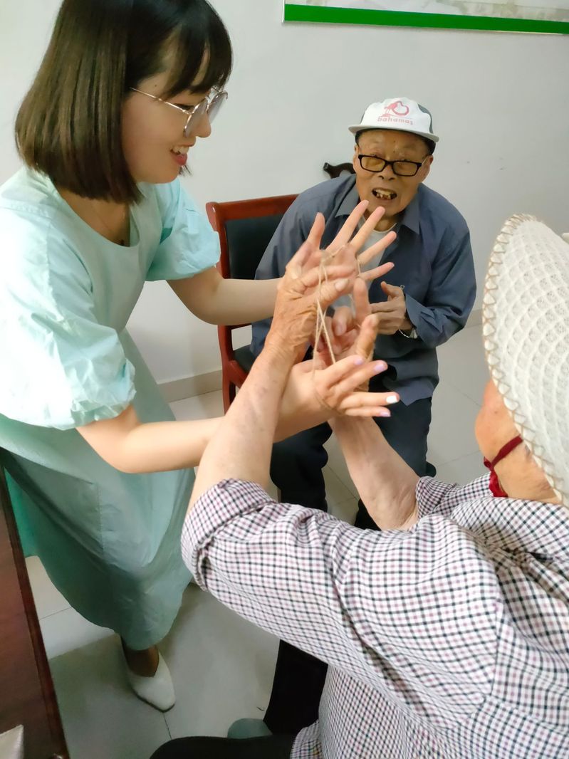 當天下午,工作人員在中心與老人玩起了翻花繩、唱童謠、猜謎語等活動,用獨特的方式重溫兒時的美好時光,追憶童年。“時間好像一下子回到了50年前,真是沒想到都這把年紀了還能過六一,上次居然還上了那個抖音,家里人看了都說外婆成明星了。”顧奶奶笑著眼睛瞇成一道線說道。“我們平時和小孩接觸,都是看他們玩。今天我們也成了主角,可以和你們一起玩,還給我們敲背捏腿,真是太高興了。”