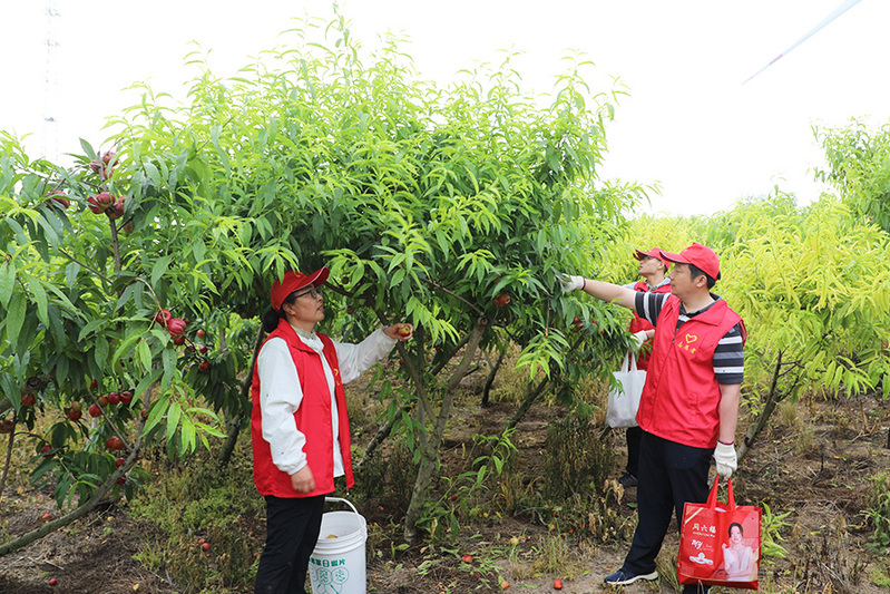 “今天來這里幫綠農園公司摘桃子,我們就是要將學黨史、辦實事落實到實際行動上?!薄巴ㄟ^參加志愿活動,為企業發展出點力?!秉h員志愿者們說。