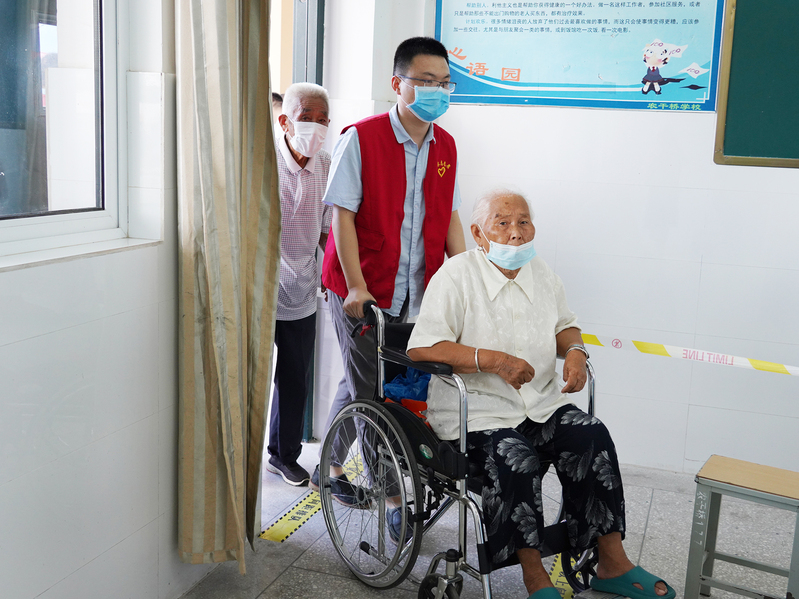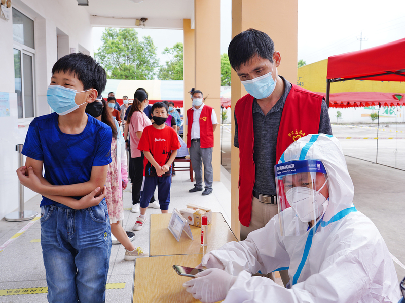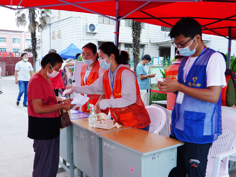 “您好,請出示您的健康碼和行程碼”,在測溫區,志愿者們耐心地為參與演練的居民們測體溫,檢查健康碼和行程碼,用高度的責任心守住第一道關心。“老大爺,您行動不便,請走這邊的專用通道”,在緩沖區,志愿者們及時引導并一趟趟攙扶老年通過專用快速進行檢測。“請大家做好一米間隔,戴好口罩”,等待區內,志愿者們隨時提醒排隊人群做好自我防護,保障臨檢隊伍秩序井然。炎熱的天氣,信息采集區身穿隔離服的志愿者們早已汗濕衣裳,卻沒有人喝一口水。