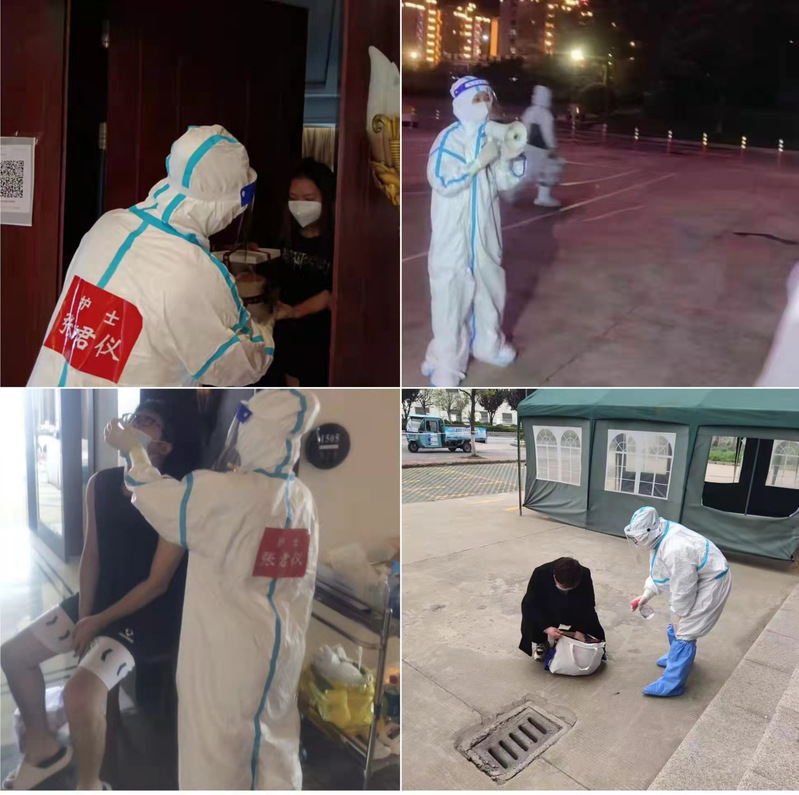 隔離點的工作繁瑣、繁雜,防護措施嚴格,每次進入隔離區(qū)前要在準備間戴帽子和N95口罩、穿防護服、戴護目鏡、穿靴套等保護設施,穿戴好防護用品后,她給隔離人員分發(fā)三餐,配備1:1000的消毒液進行隔離房間的環(huán)境消殺,并將所有隔離人員的物資、生活用品、所產(chǎn)生的醫(yī)療及生活垃圾都要一層一層爬樓梯搬運,由于射陽西區(qū)人才公寓隔離點沒有電梯,再加上嚴實密不透風的防護服,就是一動不動,也會大汗淋漓,每次都是內(nèi)層衣濕透,汗流浹背,工作完成一半就已經(jīng)精疲力盡,只能原地休息幾分鐘再繼續(xù)上下樓梯完成工作,一套流程做下來都要近五個小時。有時面對不理解、有抵觸情緒的人員,她會以盡心盡力的服務給他們以溫暖、依靠、希望及強有力的支撐,她說:隔離是對自己負責、對大家負責、更是對我們國家負責,你們是為國家早日戰(zhàn)勝疫情作貢獻,鼓勵他們積極配合隔離點做好隔離工作。