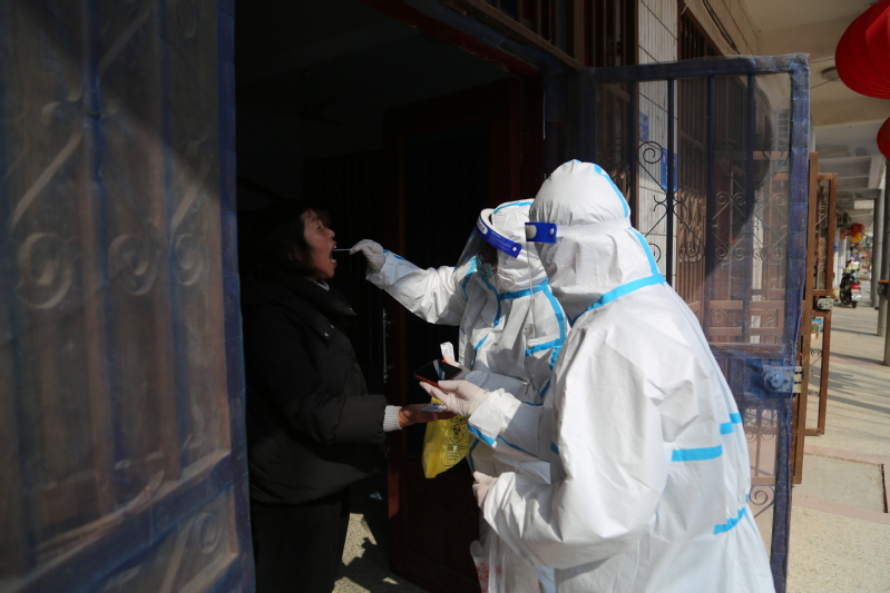 3月5日,連云港市海州區(qū)通報發(fā)生新冠肺炎疫情,形勢十分嚴峻。崗埠上下迅速行動起來,按照要求組織開展全員核酸檢測。全員核酸檢測要求一天內對崗埠所有在家人員進行檢測,農場四個點位同時開始,負責檢測的人員特別緊張。馬素蓮得知這一情況,主動和相關人員溝通,暫停了自家門診,帶領醫(yī)生錢冬梅、護士錢明霞加入了振興廣場籃球場監(jiān)測點的核酸檢測人員隊伍。從3月5日到11日,她們三人一直堅守在核酸檢測一線,每天檢測人員合計達到兩三千人。有時候,她們需要配合網格員深入鎮(zhèn)區(qū)、生產區(qū)各居委會上門為行動不便的人員進行采樣,足跡遍布大街小巷,密不透風的防護服常常讓她們滿臉通紅透不過氣來。護士錢明霞告訴筆者,3月11日當天,她負責部分小區(qū)的核酸采樣工作,光是6樓就爬了6次,腿最后跟灌了鉛一樣,挪不動?!坝袝r候晚上嘴里吃著東西就睡著了?!?/span>