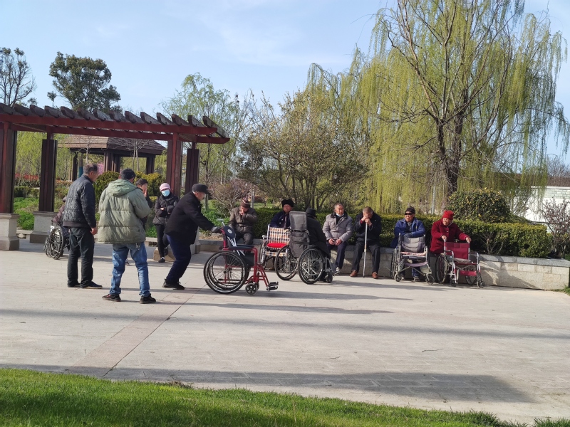 我們發(fā)現(xiàn),來(lái)這里休憩的老人中,推著輪椅來(lái)的老人特別的多,這些老人中,有自己轉(zhuǎn)著輪椅過(guò)來(lái)的,也有兒女推著他們過(guò)來(lái)的。“我爸總是讓我將他推到公園中來(lái),他就喜歡與同齡人在一起熱鬧熱鬧,這樣他的心情才舒暢。”胡鐵成的兒子將老人推到公園坐椅著時(shí)對(duì)我說(shuō),“老人怎么說(shuō)怎么好,我們做兒女的,滿足下他們的心愿就好了。圖為老人們?cè)谝黄鸾徽剷r(shí)的鏡頭。
