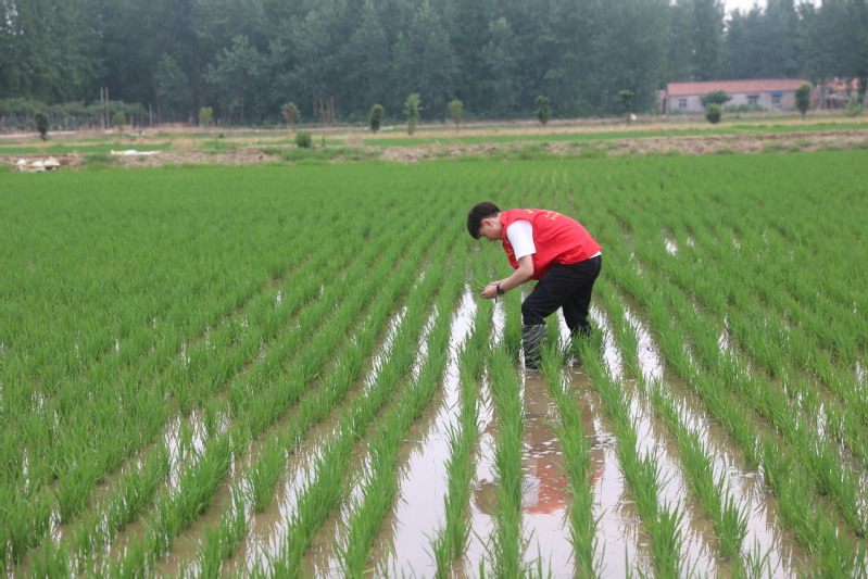 630日,寶應湖農場一生產區水稻田里,一名身穿紅馬夾的小伙子小心翼翼地沿著秧苗行距一邊查看長勢,一邊慢慢地移動腳步,唯恐傷著一棵秧苗,他就是“95后”農業技術員高全成。
