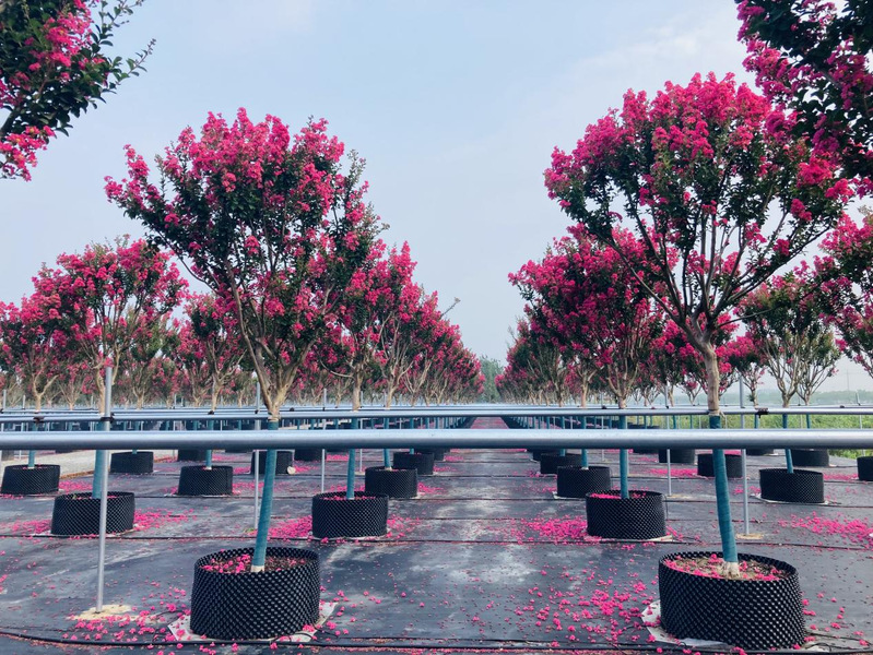 新洋林業公司容器苗三期當下正是一幅花開似霞的盛景,紫薇花團團簇簇掛滿枝頭,相當奪目。拳頭產品“四川紅”紫薇是農場公司黨委和林業公司4月份頂著疫情的壓力,積極爭取引進的產品,到了7月份便成為了附近居民的網紅打卡產品,獲得了居民們的一致好評和稱贊。其花期極長,從6月一直持續到10月,宋代楊萬里贊曰:“誰道花無紅百日,紫薇常放半年花。”明代薛蕙詩云:“紫薇開最久,爛漫十旬期。”因此,紫薇也有“百日紅”之稱。