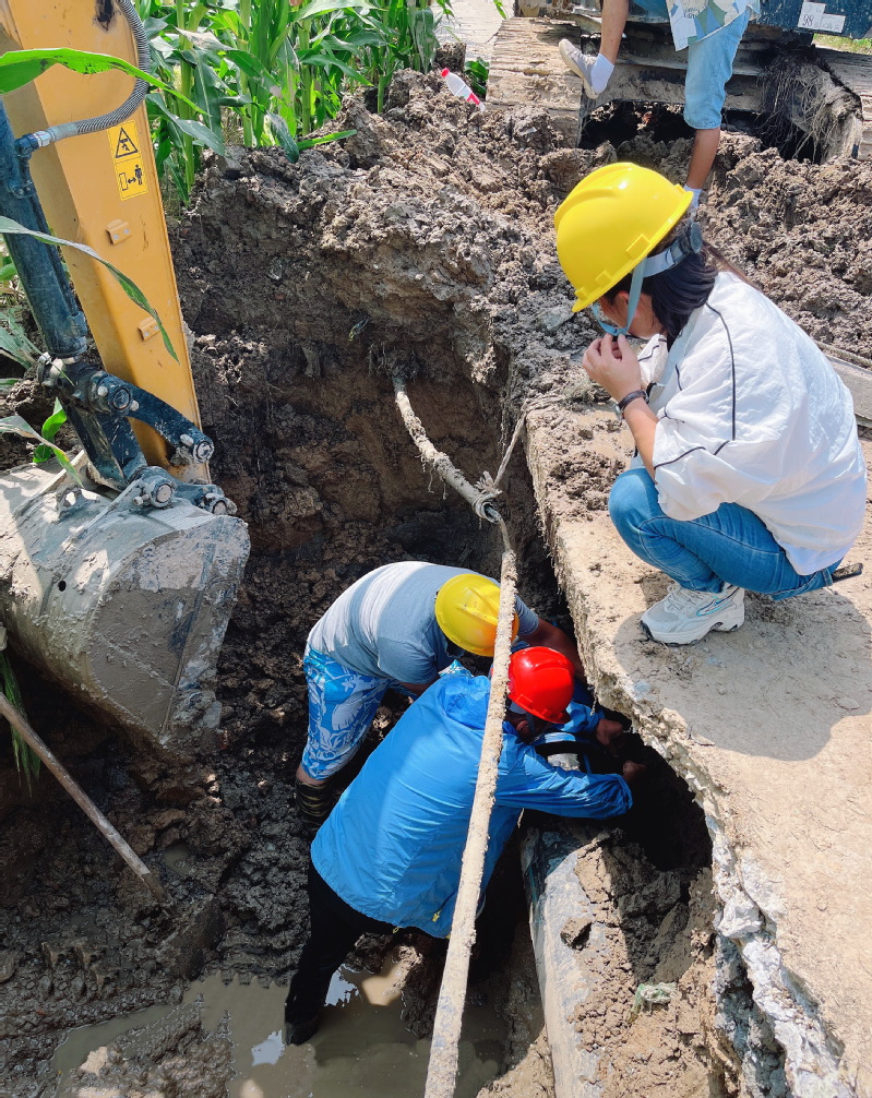 隨著調(diào)來的挖掘機(jī)清理掉外圍的泥土后,公司員工小心翼翼地沿著滲水的方向掏掉主管道外側(cè)的泥土。原來是當(dāng)時鋪設(shè)管道施工時,在管道下方泥土中埋有一塊尖銳角的石頭,隨著時間的推移和公路車輛的長期輾壓,主管道下沉后被石塊擠破了壁管而造成滲漏。