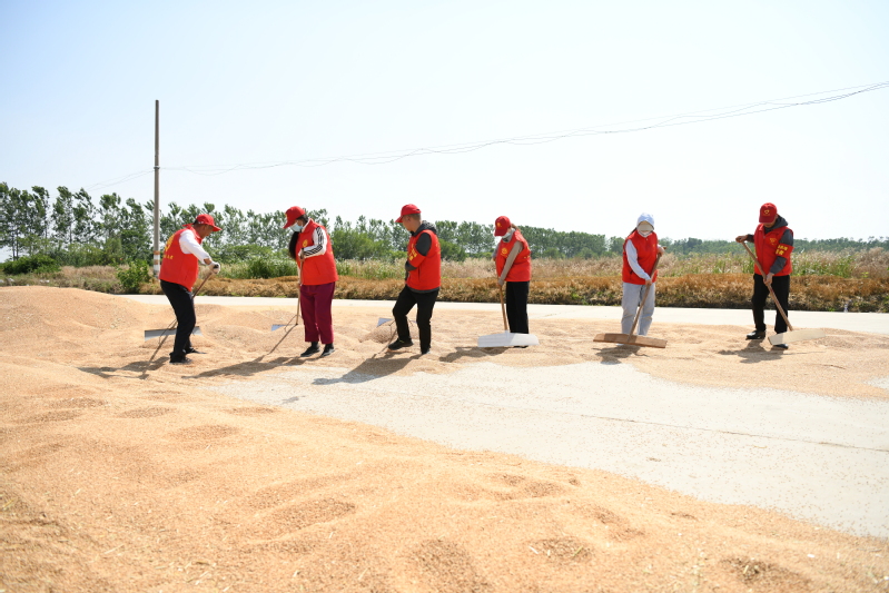 沖鋒在前,做好“助收員”。聞令而動、依令而行,社區(qū)黨組織組織黨員干部深入三夏工作一線,幫助生產(chǎn)區(qū)搶收晾曬,曬場上,大家頂著烈日,及時翻、晾登場小麥。
