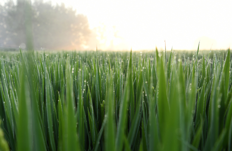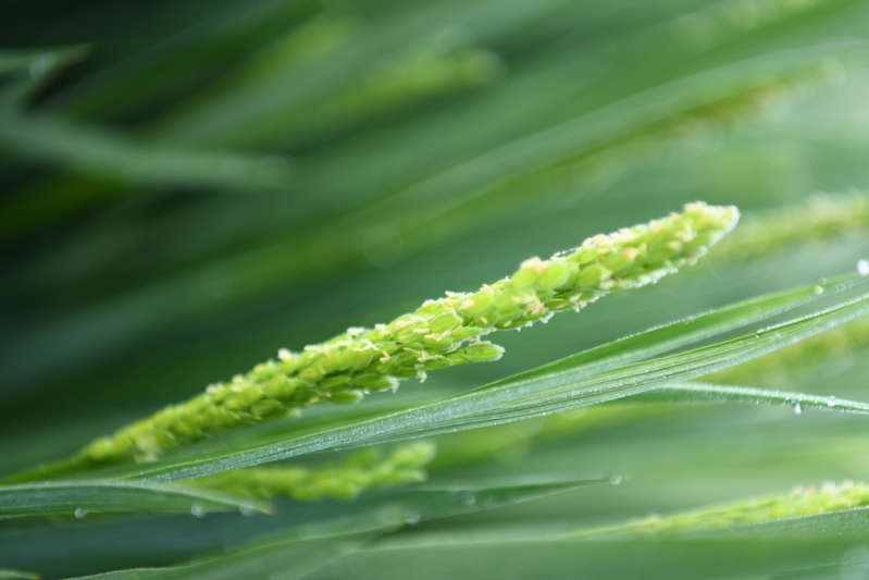 陽光下,霧氣散,空氣中彌漫著清新的稻花香。俯瞰蔥綠的稻田,如一條條綠絲帶整齊排列。晶瑩的晨露凝結在青翠的秧苗上,猶如給稻田蒙上了一層剔透的面紗。剛抽出的稻穗上,有白色的稻花點點,隨著稻穗一起隨風輕舞飛揚。小蜘蛛也趕來湊個熱鬧,在枝葉上織起了秋的毛衣。