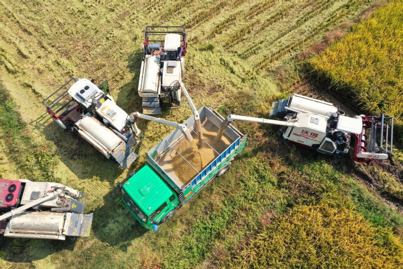 10月17日,寶應(yīng)湖農(nóng)場(chǎng)5萬(wàn)畝稻田開(kāi)鐮試割。三四臺(tái)收割機(jī)來(lái)回穿梭、相互協(xié)作,粒粒飽滿的水稻收割脫粒,很快就被裝進(jìn)運(yùn)輸車?yán)铮S后運(yùn)送至場(chǎng)頭過(guò)磅晾曬。農(nóng)技人員穿梭在剛收割完畢的田塊里,根據(jù)收割機(jī)的實(shí)際收割質(zhì)量,進(jìn)行指揮調(diào)整,把“豐收在望”變成“豐收在手”。