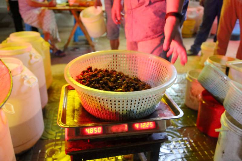 夏夜暑熱退去,新曹農場河邊林帶、國道兩側、集鎮周邊,小樹林里經常光影搖曳、星星點點,人們拿著手電筒等照明裝備仔細在每棵樹上尋摸,只為找到獨屬夏季的舌尖美味——金蟬。老百姓熱衷抓蟬、吃蟬,價格由最初的每只0.3元到如今的每只1元左右,10年內小小金蟬身價翻了3倍,一躍成為新的致富“頂流”。“金蟬捕捉高峰期能有20多天,一家人一晚可以捉1000多元,每年靠捉金蟬就有近2萬元的收益,我們這一個點一晚收購數量在5000斤以上,平均價每斤90元以上,年產值900萬元。”金蟬收購點老板何成剛說。