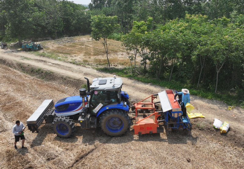 5月28日、「9機能一體型」稲?麥用耕運播種機にもみを補充する三河農場の職員。(ドローンから、盱眙=新華社記者/季春鵬)