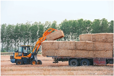 在江蘇省連云港市海州區的江蘇農墾崗埠農場,農民在田間打捆回收小麥秸稈,進行集中轉運堆放。