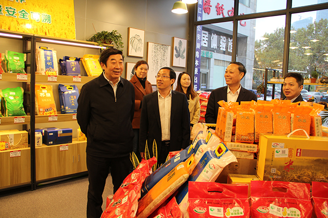 11月8日,集團公司總經理胡兆輝到蘇墾金橋公司調研指導工作。副總經理仲小兵、蘇墾農發總裁蘇志富以及集團公司資產經營部、蘇墾米業、蘇墾園藝負責人陪同調研?! 『纵x一行先后考察了蘇墾生態農產品直銷中