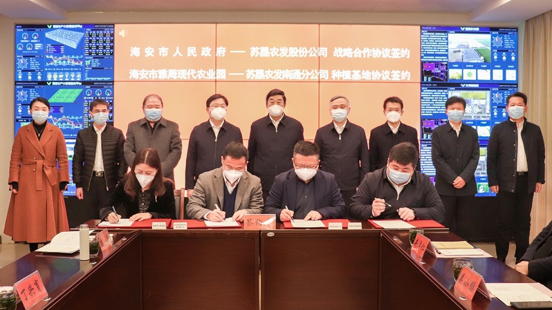 12月16日上午,蘇墾農發股份公司與海安市人民政府戰略合作協議簽署儀式在海安雅周現代農業園舉行。集團公司黨委副書記、總經理胡兆輝,海安市市長譚真出席儀式并致辭,蘇墾農發股份公司總裁與海安市副市長分別代表雙方簽署戰略合作協議。胡兆輝對海安市長期以來給予江蘇農墾的關心支持表示感謝,向協議的簽署表示祝賀,并介紹了集團公司歷史沿革和改革發展取得的顯著成效。胡兆輝指出,雙方長期保持著密切合作,共同肩負保障國家糧食安全的政治責任,在建設高標準農田、創建國家現代農業產業園、打造全省一流的糧食生產示范基地等方面目標吻合、方向一致。今年以來,雙方繼續深化合作,積極推動建立蘇墾農發南通分公司海安基地,著力打造輻射帶動周邊的綠色稻米產業基地、糧油輪作示范基地、現代農業示范基地。胡兆輝表示,雙方要緊緊圍繞黨的二十大精神,沿著習近平總書記指引的方向深耕農村、深化合作,實現資源共享、優勢互補,共擴種植規模、共建種繁基地、共創示范效應,攜手打造省屬國企和地方合作的標桿典范。譚真代表海安市委市政府對胡兆輝一行的到來表示歡迎,對江蘇農墾長期以來關心支持海安“三農”事業發展表示感謝。譚真表示,雙方戰略合作的達成,將對海安