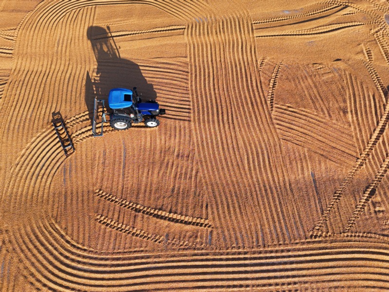 2025年10月9日,江蘇農墾崗埠農場,職工駕駛糧食翻曬機,利用晴好天氣抓緊翻曬剛剛收獲的玉米,確保秋糧顆粒歸倉。