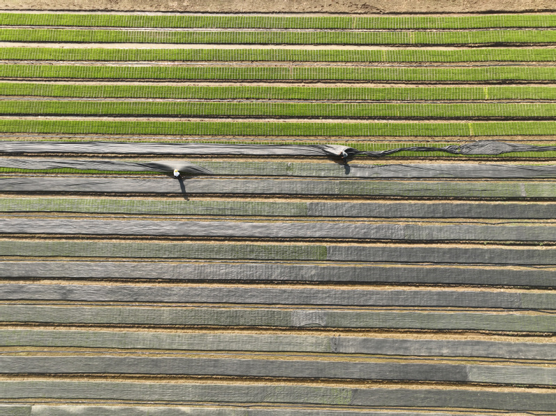 在蘇墾農發崗埠分公司田頭,職工們正在把經“暗化”后的秧盤移到大田里,采用微噴灌技術進行集中育秧,加強精準水肥調控、集中標準化育秧管理,為即將開展的機插秧作業夯實基礎。