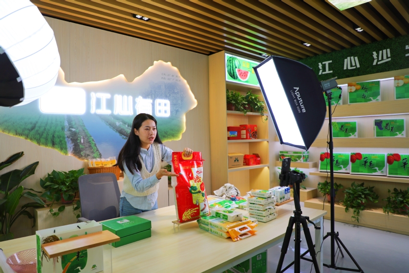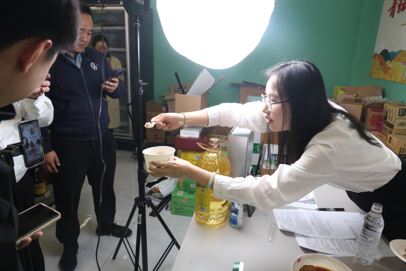 蘇墾南通公司積極與南通團市委合作,在銷售門店開辟“新農菁英產品”專區,匯聚南通各縣市區的地方特色優質農產品,豐富周邊居民的購買選擇。圖為公司青年員工借助抖音直播推廣帶動產品銷售,拓寬增收渠道。