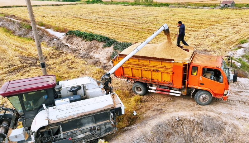 “開鐮了!豐收了!”10月23日上午,多臺收割機駛向蘇墾農發新洋分公司高標準農田,4.5萬畝優質水稻喜開豐收第一鐮。伴隨著隆隆的轟鳴聲,金黃色的水稻被機械收入“囊”中,轉眼間變成金燦燦的稻谷,匯聚成一幅秋日豐收美景圖。收割現場,新洋嚴格收割質量監督,把機械減損作為糧食增產的重點,加大收割質量檢查力度,減少收割損失,確保收割損失率控制在1%以內,收割破碎率在2%以下。“我們密切關注天氣情況和水稻成熟度,立足“前期‘揀’收、中期‘穩’收、后期‘搶’收”的原則,穩步推進收割進度,適時收、曬、烘,為秋播及時騰茬。”農業中心負責人周凌云介紹。今年“三秋”出現了連續陰雨等不利天氣,對機械力量、場頭統籌、糧食調運等應急能力帶來考驗。面對不穩定天氣等因素,蘇墾農發新洋分公司強化機械保障,本部準備大型聯合收割機18臺套,拖拉機300余臺,另調度好61臺小型履帶式收割機,隨時應對突發天氣情況。同時,加強場頭糧食調運管理,備好防雨防霉變應急保障設施設備,確保烘干設備正常運轉和安全,實現秋糧顆粒歸倉。隨著秋收工作的全面展開,耕、耙、旋、播等工作也在同步進行,新洋上下牢固樹立“一盤棋”思想,切實把“三秋”工作作