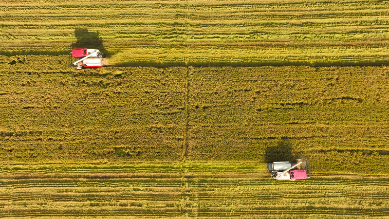 10月5日,大、小型號的收割機馳騁在蘇墾農發東辛分公司的玉米大豆帶狀復合種植田中,搶收成熟的玉米大豆。據悉,今年“三秋”時節,江蘇農墾已準備好大、小型號收割機2269臺保障收割工作。近年來,江蘇農墾大力推進農業機械化、智能化,主要農作物耕、種、收綜合機械化率超98%,每萬畝農田農機裝備動力達到發達國家水平。