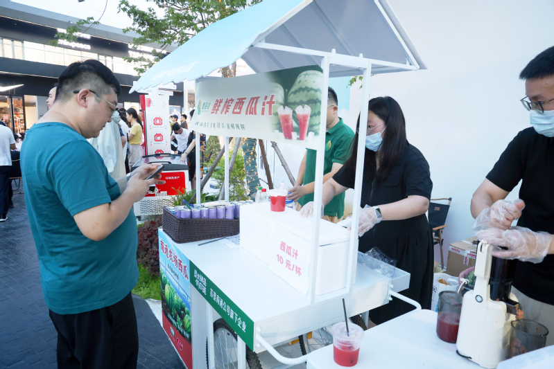6月29日,“蘇超”聯(lián)賽焦點(diǎn)戰(zhàn)——南通隊(duì)對(duì)陣宿遷隊(duì)的較量火熱打響,蘇錫通園區(qū)楓葉小鎮(zhèn)奧特萊斯“第二現(xiàn)場(chǎng)”化身一片歡樂海洋。場(chǎng)內(nèi),巨幕大屏實(shí)時(shí)捕捉著賽場(chǎng)每一寸風(fēng)云變幻,將攻防轉(zhuǎn)換的緊張刺激清晰投射;場(chǎng)外,攤車次第鋪開,循著光影軌跡駛?cè)胪挼拿朗惩鯂D贤ü卷槃?shì)借“蘇超”賽事的火熱東風(fēng),特別推出農(nóng)場(chǎng)直供的鮮榨西瓜汁——炎炎夏日里,這份冰爽與甘甜恰似一劑及時(shí)的“救贖”。捧起西瓜汁猛灌一口,帶著沙沙綿密口感的清甜瞬間漫過舌尖,將積攢整日的燥熱滌蕩一空。賽事開始后,現(xiàn)場(chǎng)氣氛愈發(fā)沸騰,數(shù)千人流交織著歡聲與笑語,鮮榨西瓜汁也順勢(shì)迎來了銷售熱潮。當(dāng)晚9時(shí),所有鮮榨西瓜汁便銷售一空。杯盞間的余味里,那一份清爽甘洌陪伴著意猶未盡的旅客,將賽事熱情延續(xù)到深夜。