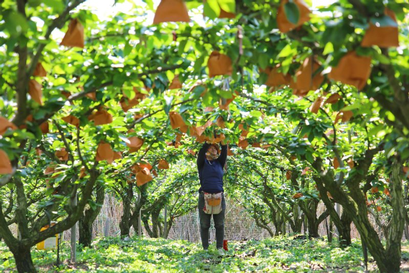 近日,江心沙農場果農在梨園里忙著為梨子套袋,有效降低病蟲害發生風險,提升果實外觀和內在品質,促進增產增收。